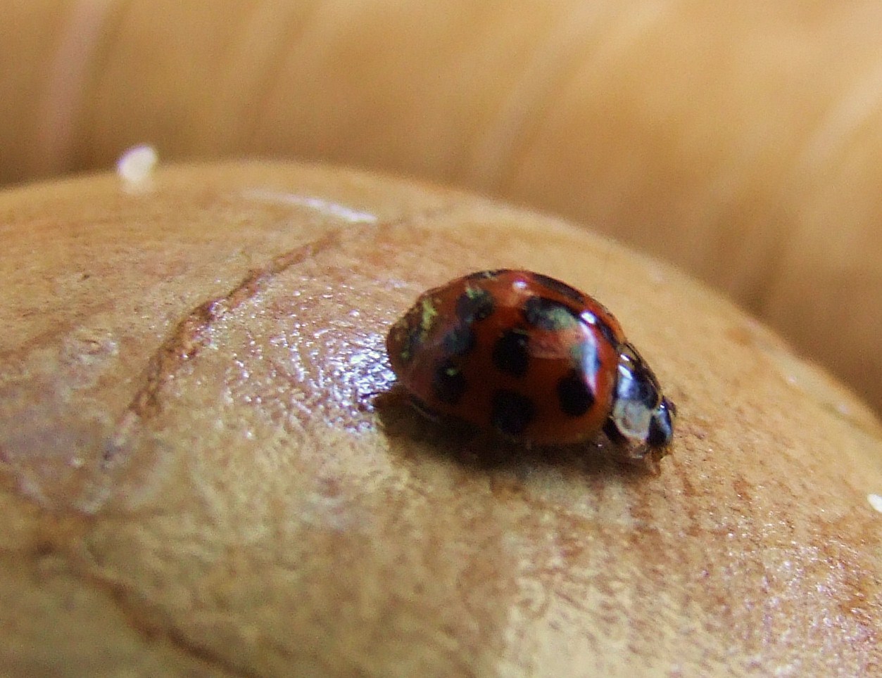 Edited: The ladybug was crawling across a hickory chair that we have outside. It is on one of the tops of the back that is a rough cut piece of wood lacquered.