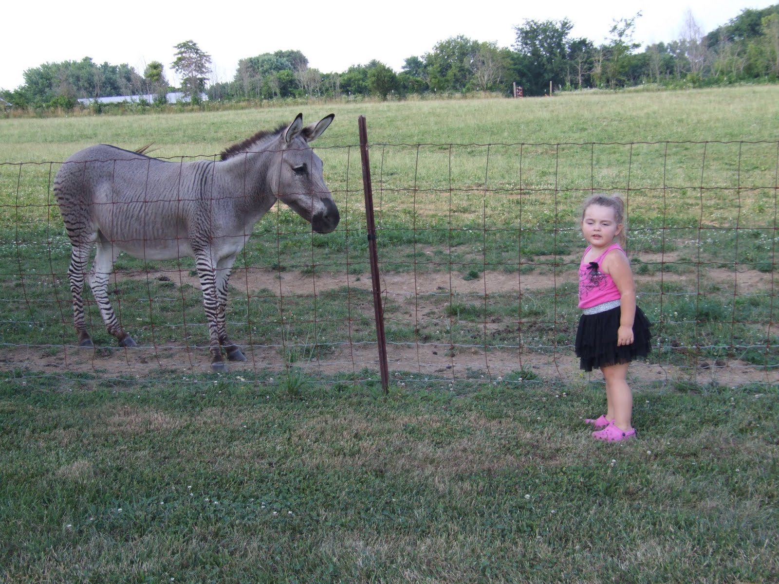 ,Belly became entranced with a zebra/mule mix and it was entranced right back at the little girl in a tutu.