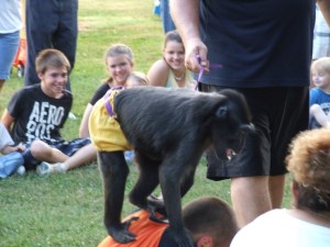 This ape wildly jumped from child to child. Sometimes pushing the child’s chest and sometimes jumping on their head. My children did not sit in the circle. Call me “THAT” mom, but I was not comfortable with the situation at all.