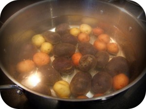 Wash potatoes and boil them for around 7 minutes or until slightly soft. (Pop one of these suckers in your mouth because it is killing you to know what a purple potato tastes like. Eat another one because they were really good!!)
