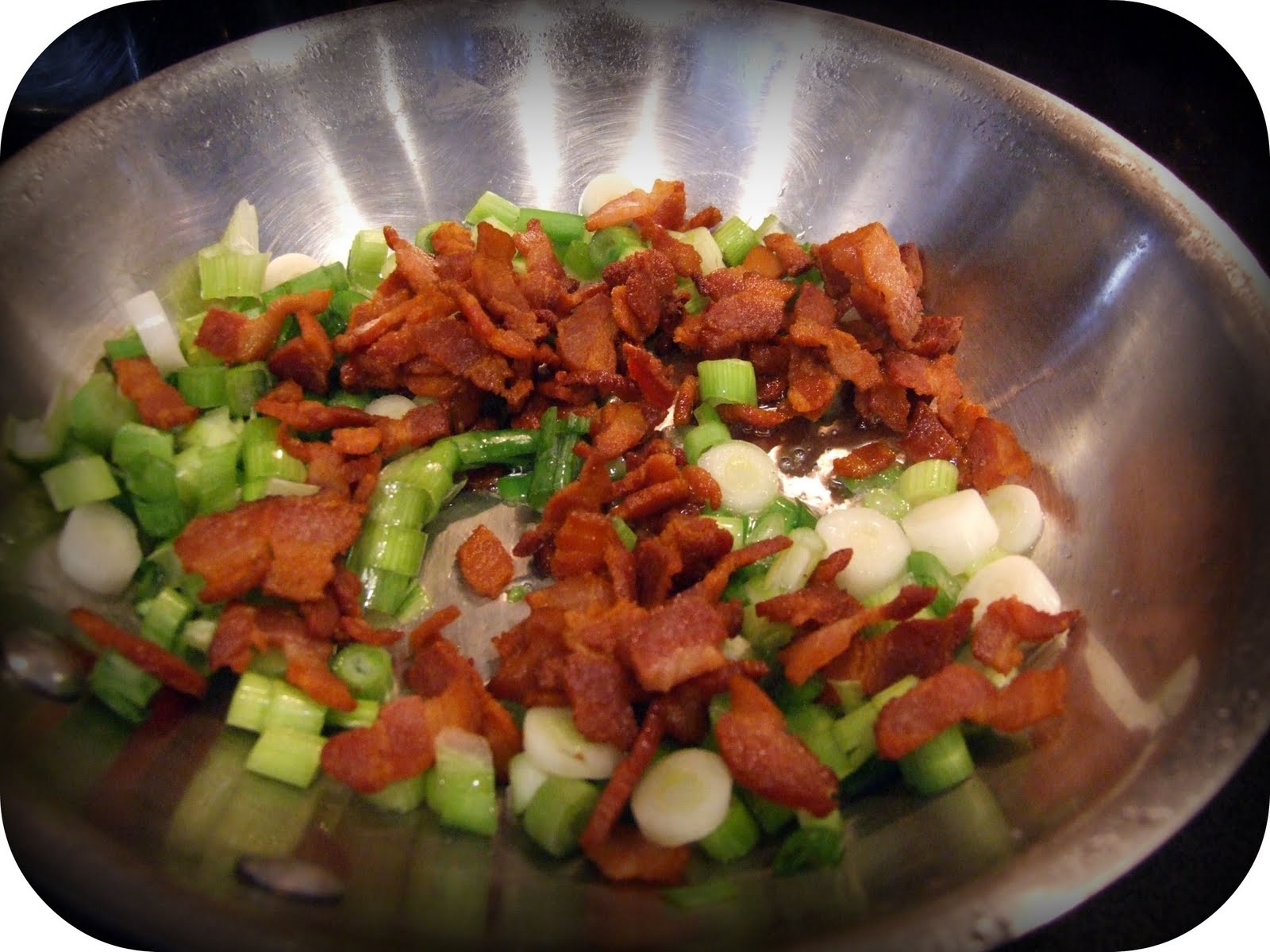 Saute green onions and bacon together in a small skillet until browned. Set aside.