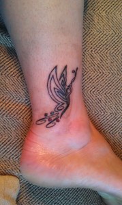 I probably should have shave my legs before this picture but hey…whatever. I chose a butterfly because it is my “symbol”. I could go all metaphoric on you, but I’m sure you can figure it out. I mentally prepared myself for the pain, but I realized that my preparation was almost not enough. My sisters were with me and I treated it like I was in labor. I chose them to be my focal point. They reminded me to breathe and then when it got really bad…my twin handed me her iPhone and I watched happy scenes from Mary Poppins. The artist (if you call someone who is carving on your skin an artist) laughed and said that was a first in the studio. Nothing like a spoon full of sugar to make the etching go down.