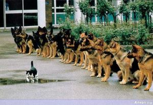 I don’t know whether or not that cat felt confident as it walked in front of all the dogs, but it went forward anyways.