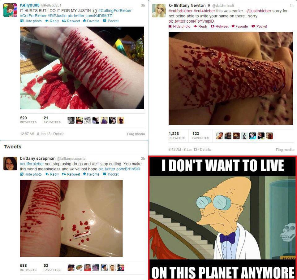In case you can’t tell in the picture, it is tweets sent by “kids” who are “cutting” for Justin Bieber. Seriously. This was put on FB and I started scrolling through the comments. Someone made the comment it was idiotic and this is some of the replies…