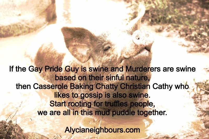 If the Gay Pride guy is a swine and the Murderers are swine based on their sinful nature, then Casserole Baking Chatty Christian Cathy who likes to gossip is also swine. Start rooting for truffles people, we are all in this mud puddle together.
